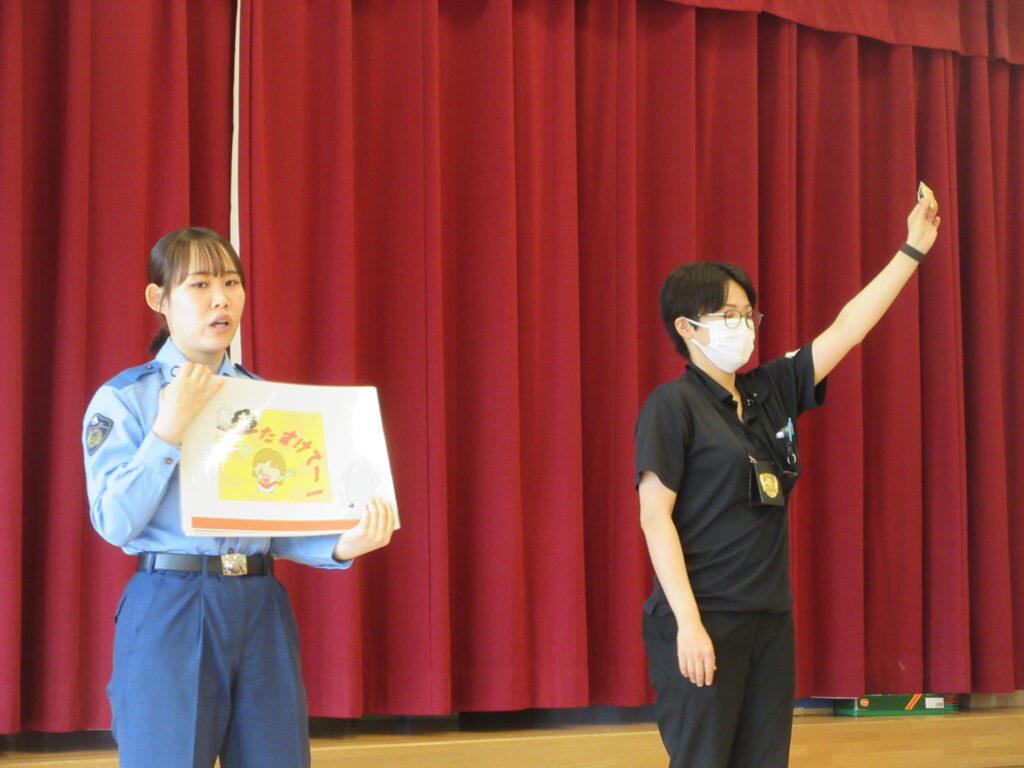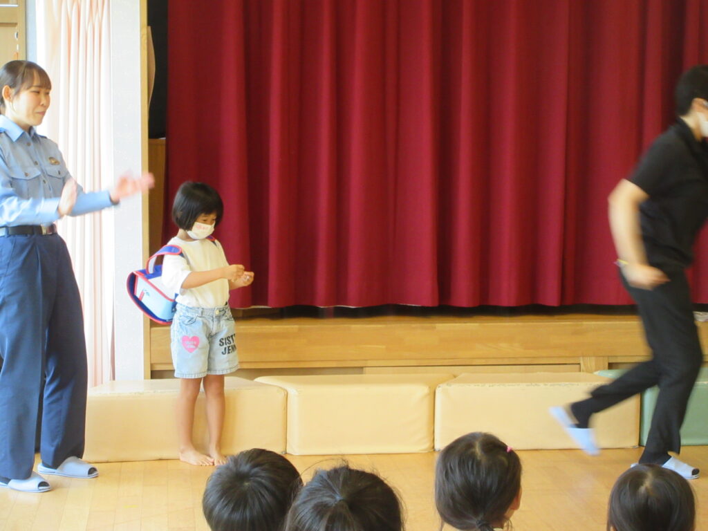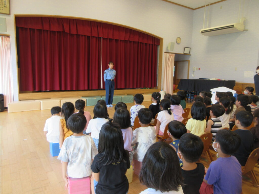 防犯教室(9月4日) 投稿日 2025年9月22日 著者 上北条保育園 カテゴリー お知らせ 倉吉警察から来ていただき、防犯教室を行いました。 『いかのおすし』について学んだり、 年長児は 就学に向けて自分の身を守る方法を学びました。