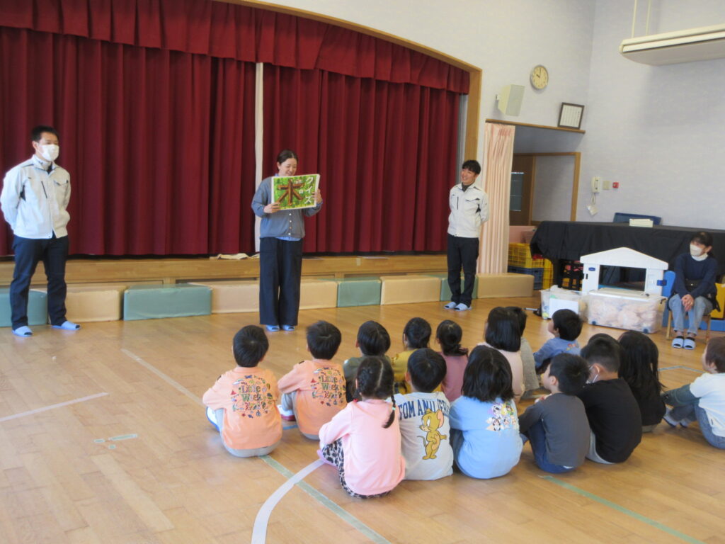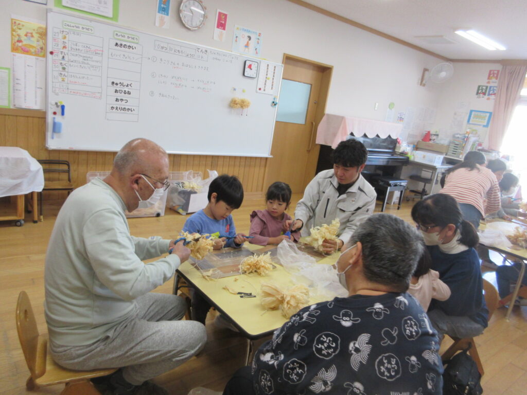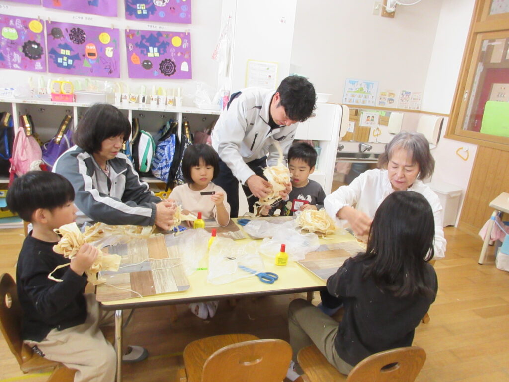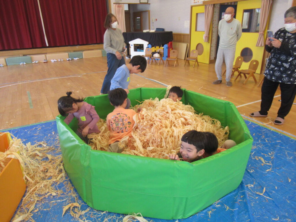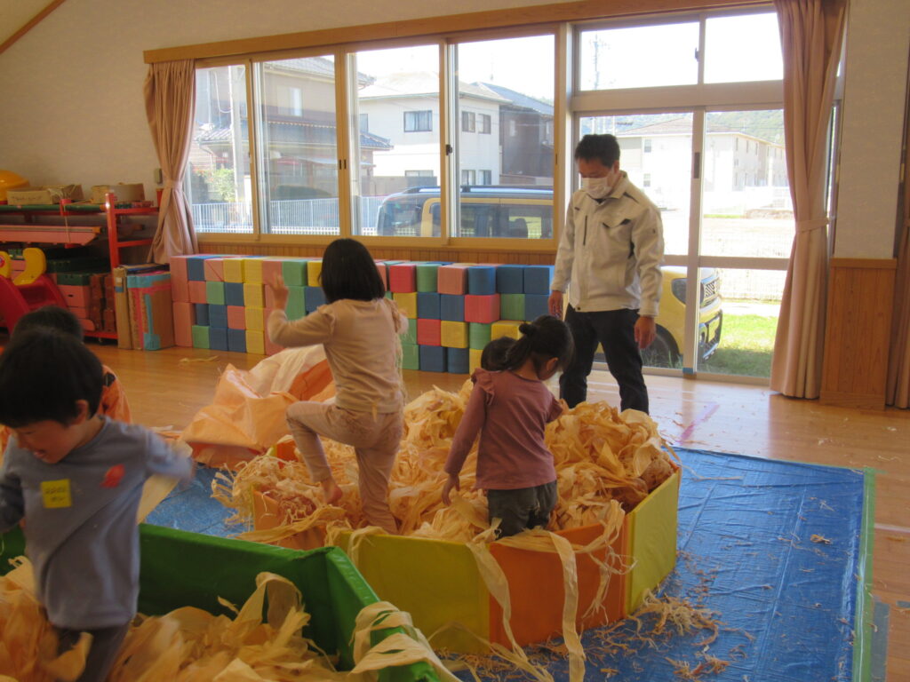 木育教室 投稿日 2025年11月1日 著者 上北条保育園 カテゴリー お知らせ 5歳児きりん組が、向井組さんに企画していただいた 木育教室に参加しました。 “木”についてのクイズでは、園や家、画用紙、鉛筆、絵本も木からできていることを知りました。 ボランティアとして参加していただいた おじいちゃん、おばあちゃんと一緒に 木の香りやあたたかさを感じながら、“モンスターポンポン作り”をしたり、“かんなくずプール”で思い切り遊んだりと楽しい時間をすごすことができました。